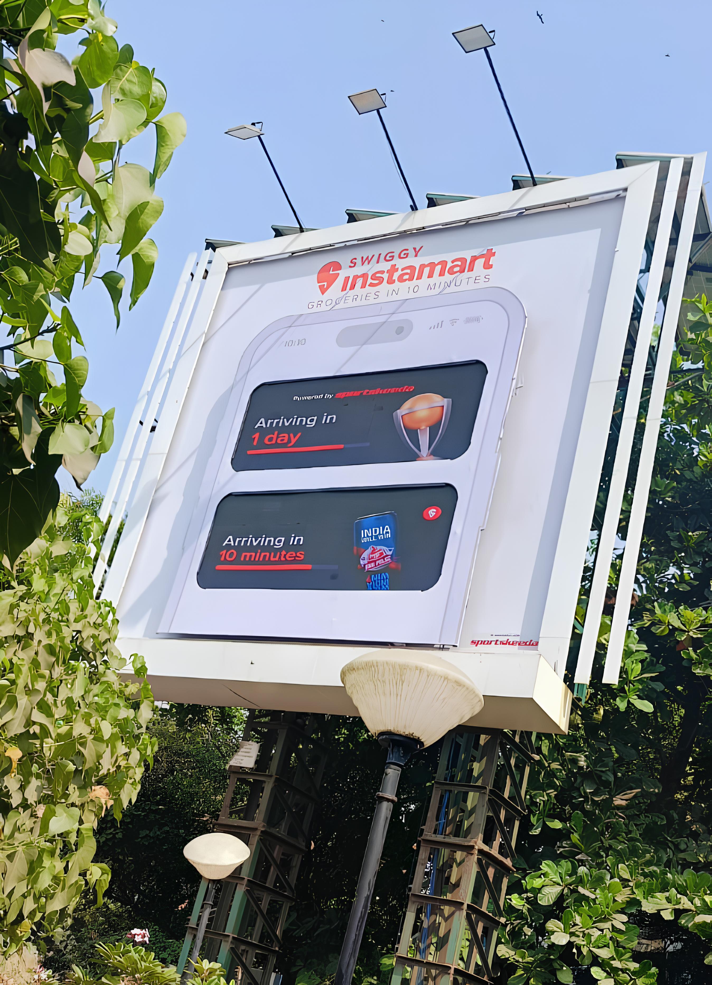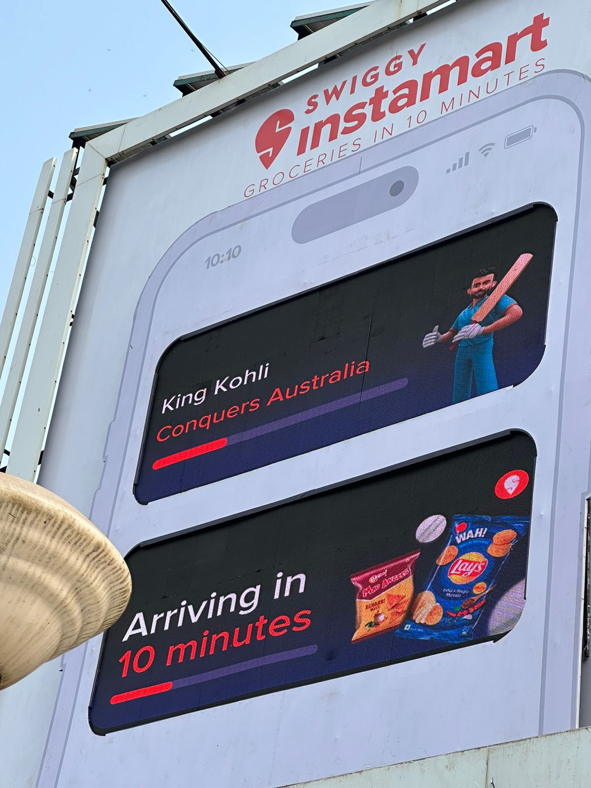 During the ICC World Cup, Swiggy Instamart turned the streets of Mumbai into a real-time cricket viewing experience with a network of dynamic digital billboards displaying live match scores. Designed to capture the excitement of the tournament, the billboards updated in real time while reinforcing Instamart’s core promise groceries and match-day essentials delivered in under 10 minutes. In partnership with Sportskeeda, the campaign combined live sports data with creative storytelling. As the match unfolded, the billboards displayed quirky, attention-grabbing prompts that connected the live score with Swiggy Instamart’s ultra-fast delivery. Messages like “Don’t miss a ball, we’ll bring the snacks” and “Big hits on the field, quick hits at your door in 10 minutes” brought humor and immediacy to the campaign. Strategically placed across high-footfall areas of Mumbai, the live billboards quickly became conversation starters. Passersby stopped to watch scores update in real time, creating mini fan moments on the streets. The innovative use of live data and contextual messaging generated social media buzz, with people sharing photos and videos of the billboards during matches. By blending live sports excitement with hyperlocal advertising, the campaign transformed traditional outdoor media into an interactive experience for cricket fans perfectly timed for the biggest matches and the perfect moment to order from Swiggy Instamart.